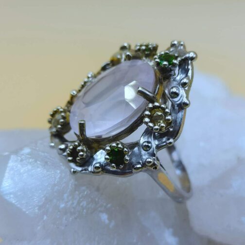 Рожевий кварц+ цитрин+ гранат+ топаз+ сапфір+ хромдіопсид каблучка 013500